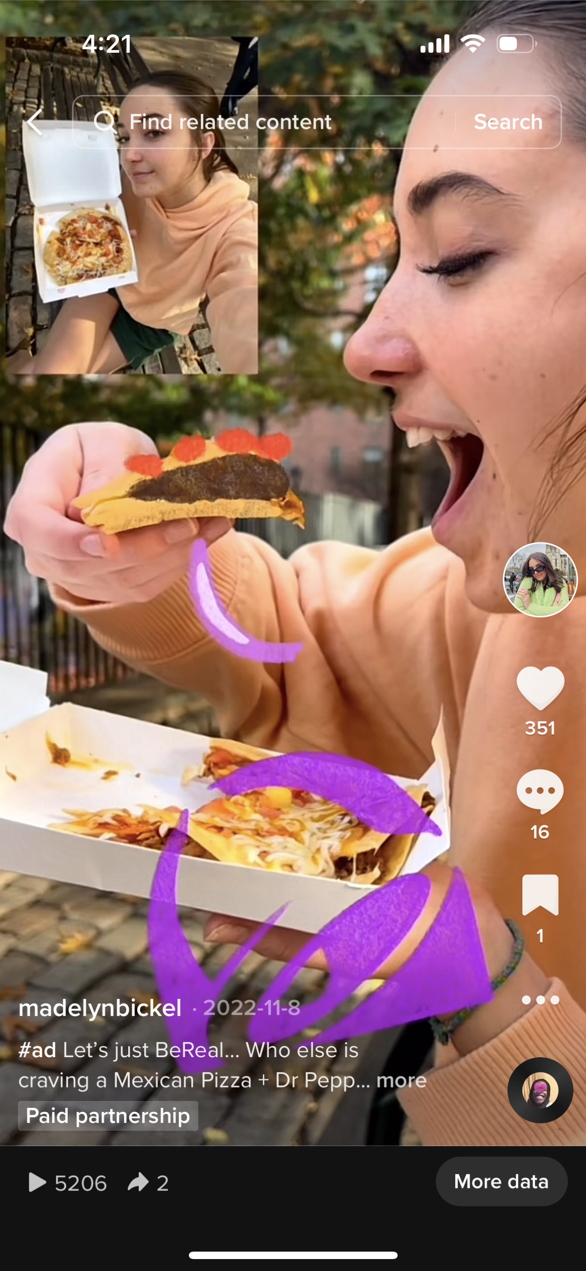 I’ve grown my TikTok to over 400,000 followers by sharing a mix of lifestyle, beauty, and art content that feels real and creative. I come up with the ideas, film, edit, and post everything myself—and I’ve had the chance to work with brands like Sharpie, Taco Bell, Rent the Runway, and Dr Pepper along the way.